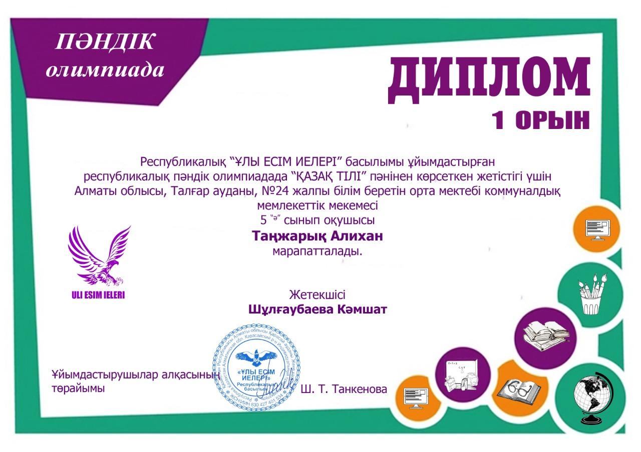 Оқушы жетістігі!!! Республикалық "Ұлы есім иелері" басылымы ұйымдастырған республикалық пәндік олимпиадада қазақ тілі пәнінен мектеп оқушылары қатысып дипломдармен марапатталды. Жетекшілері қазақ тілі мен әдебиеті пәні мұғалімі Шұлғаубаева Камшат » №24 жалпы білім беретін орта мектебі»