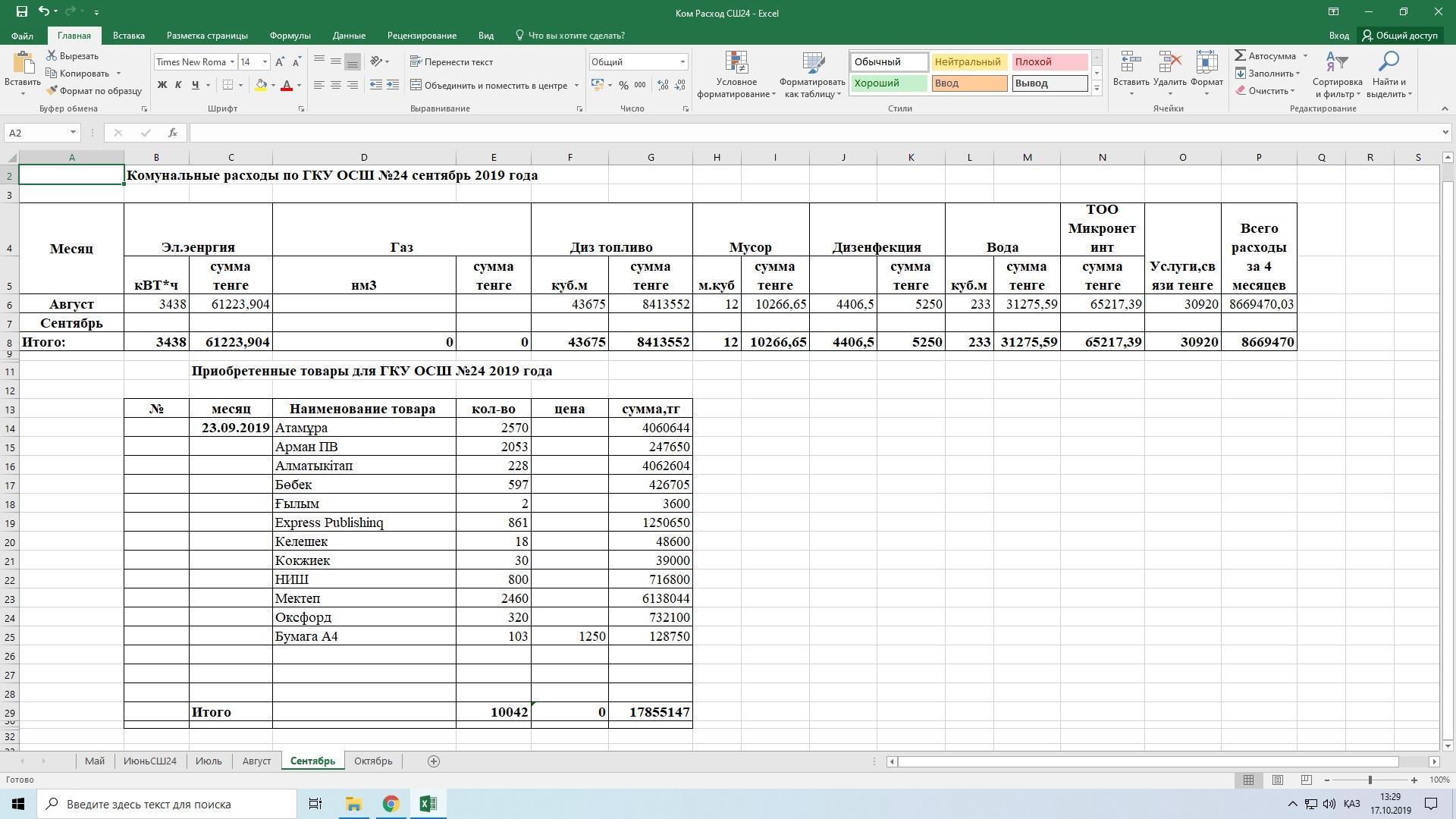 » » » Комунальные расходы по ГКУ ОСШ №24 сентябрь 2019 года