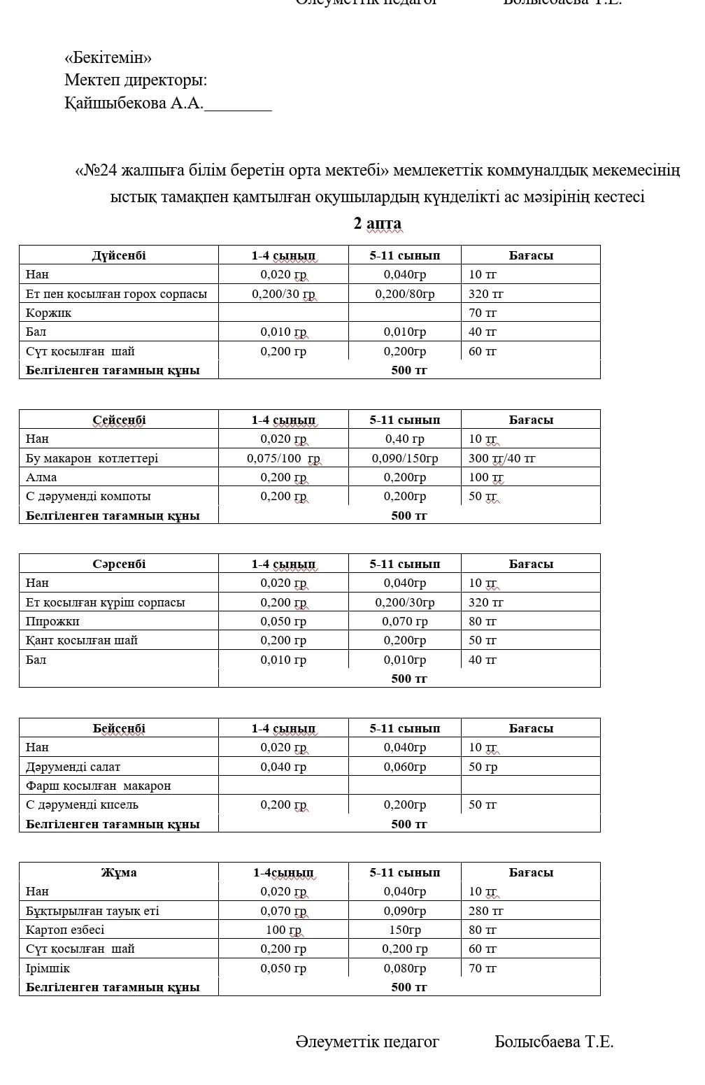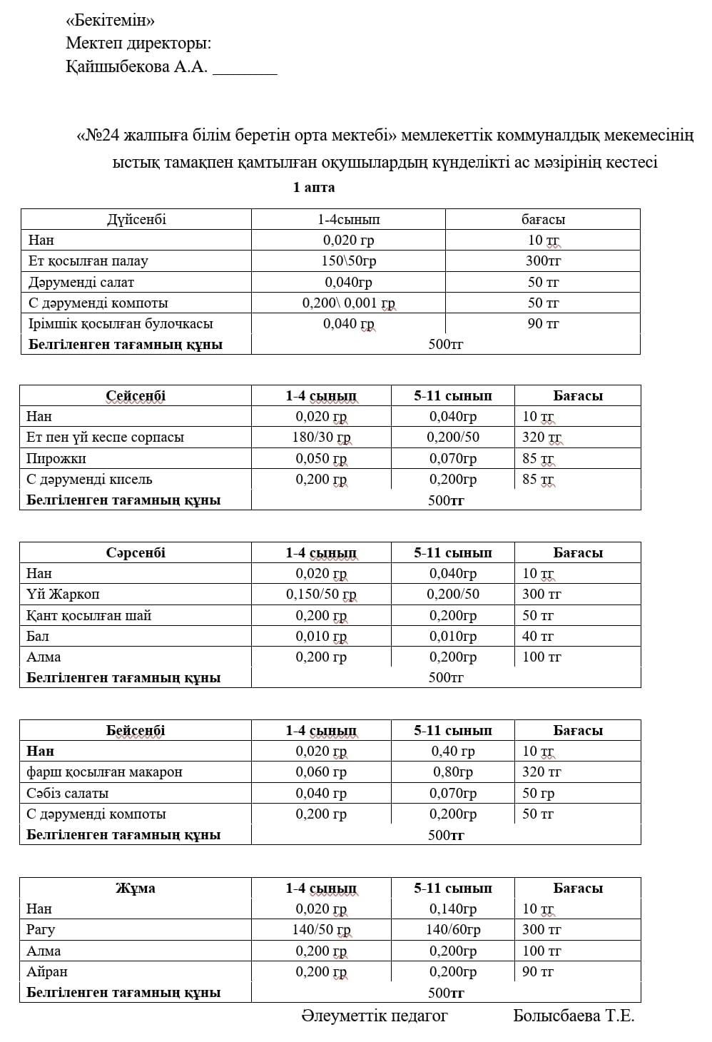 14 декабрь 2022 0 1 2 3 4 5 «№24 жалпыға білім беретін орта мектебі» мемлекеттік коммуналдық мекемесінің ыстық тамақпен қамтылған оқушылардың күнделікті ас мәзірінің кестесі